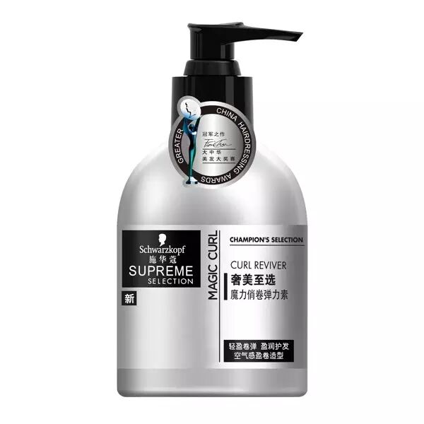 依照发流方向,一边梳理一边吹干头发,保证发线边缘平顺整齐,梳理整体造型,再取少许施华蔻奢美至选魔力俏卷弹力素涂抹发梢定型。