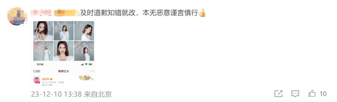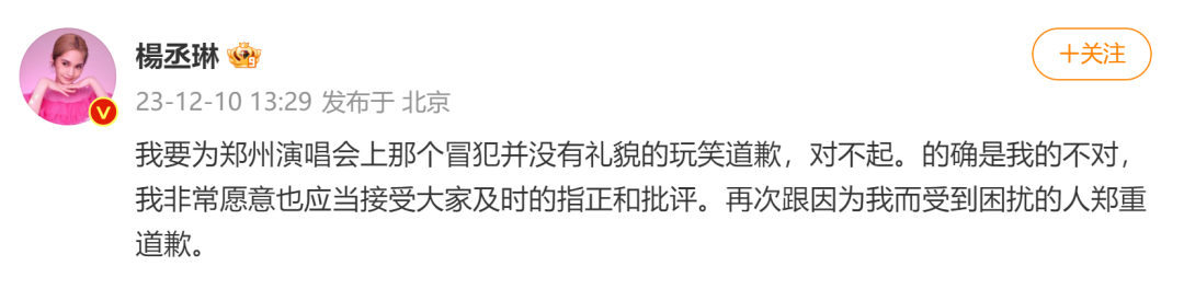 12月10日下午,杨丞琳在个人微博发文道歉: