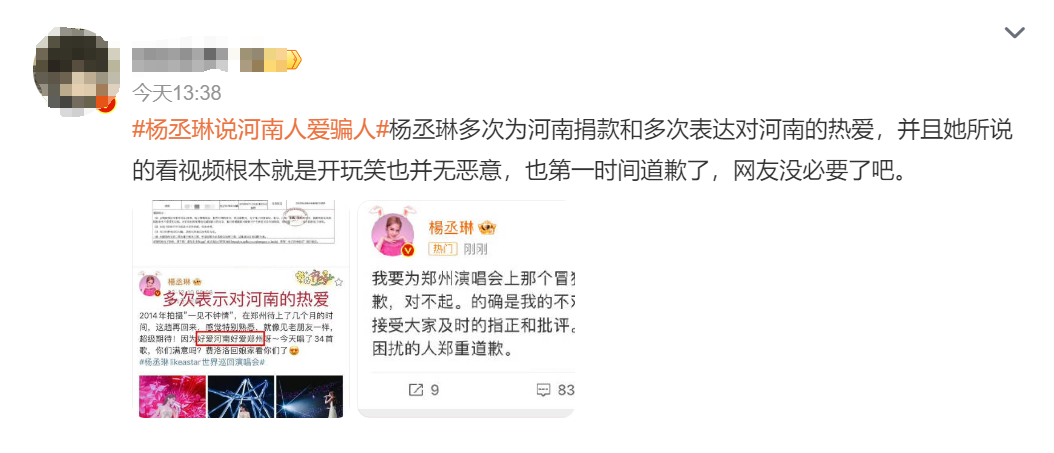 12月9日,歌手杨丞琳在郑州演唱会上开玩笑称“河南人爱骗人”,引发热议。