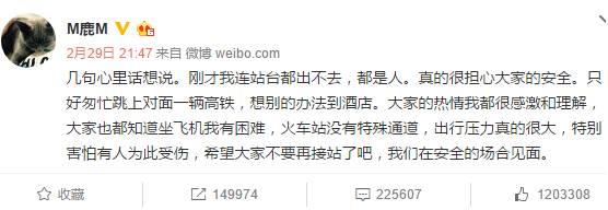 《跑男》在嘉兴录制第一期时,鹿晗在车站就被粉丝围堵得水泄不通,他第一时间发微博表示“担心大家的安全”,呼吁粉丝不要再接站,以免为此受伤。引导他们在安全场合见面,理智追星。