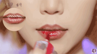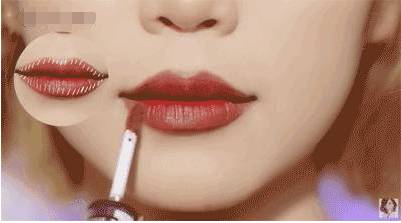 Step 1:用鲜亮一点的红色口红或唇釉点在嘴唇中间,然后用手指晕开。