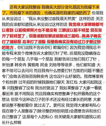 她称自己变美的首要原因是瘦身成功,加上在鼻子上打过破尿酸以及做了溶脂手术,但绝对没有在脸上动刀子