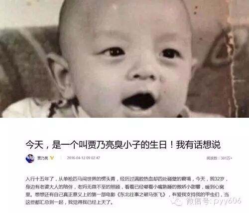 4月12日是贾乃亮生日,他在微博发表一篇名为《今天,是一个叫贾乃亮臭小子的生日!我有话想说》的文章,文中他对老婆李小璐和女儿甜馨温情示爱,“我的事业起步于她,幸福也归功于她,接下来几十年的美好生活甜馨,也是她送给我的。”也同时感谢父母的养育之恩。看完文章,网友纷纷送上祝福:“亮哥生日快乐,还有就是祝你精神病早日康复”,“难得的正经,生快!”12日上午,电影《东北往事之破马张飞》剧组在片场为贾乃亮举办生日会,台下除了同剧组演员和远道而来的粉丝朋友,李小璐与甜馨也专程前来为其庆生,贾乃亮不禁感叹这真是人生的幸福一刻。