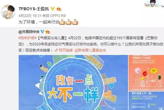 【更博】“窥屏少年”王俊凯再更博 王俊凯呼吁保护环境 TF加油站 内地男星 2016-04-25 13:47:05 176 创作不易,用心坚持,欢迎请BaGua喝几杯爱心咖啡!打赏并支持本文 打赏并删除本文 22日,王俊凯在发完蝴蝶p图、回复粉丝撩完妹之后,并没有很快的下线,而是开启了窥屏模式,这不,发现了“共青团党中央”发布的保护环境的微博,立即转发表态支持:“为了环境,一起来行动”日前,王俊凯作为“绿植大使”倡议大家领养绿苗植物,净化环境,小代言人还真是尽心尽力,棒棒哒!来源:新浪微博@TFBOYS-王俊凯 创作不易,用心坚持,欢迎请BaGua喝几杯爱心咖啡!打赏并支持本文 打赏并删除本文 感谢您的支持鼓励,我会继续努力的!文章地址:用户邮箱:打赏金额:USDT 请输入数字点击”去打赏“,即可进行打赏支持本文章哦 王俊凯 About the Author TF加油站 功能介绍:这里是TFBOYS加油站~tfboys的新闻资讯,美文美图这里应有尽有哦!欢迎四叶草们的关注~ Related Posts 【更博】王俊凯发福利 深陷民国风不能自拔 2016-05-31 16:14:25 【分享】王源:低调做人高调做事,一鸣惊人让人惊艳 2016-05-26 15:41:38 【荣耀】王俊凯连续4月夺明星榜月冠 2016-05-09 17:17:53 【更博】王俊凯帮妈妈洗菜 粉丝组团见“婆婆” 2016-05-09 17:17:53 【更博】“窥屏少年”王俊凯再更博 王俊凯呼吁保护环境 2016-04-25 13:47:05 发表评论