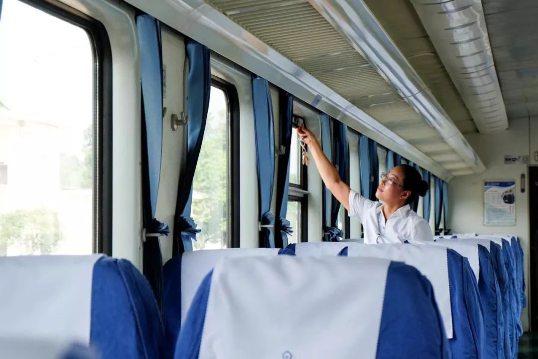 8月9日,在五凤溪火车站停留的T8865/6次列车上,列车长侯俊芳正在对硬座至硬卧车厢进行安全检查。“天黑入夜前,我们需要对全列门窗锁进行一次检查。”侯俊芳一边仔细的检查车厢车窗,一边擦着额头的汗珠。