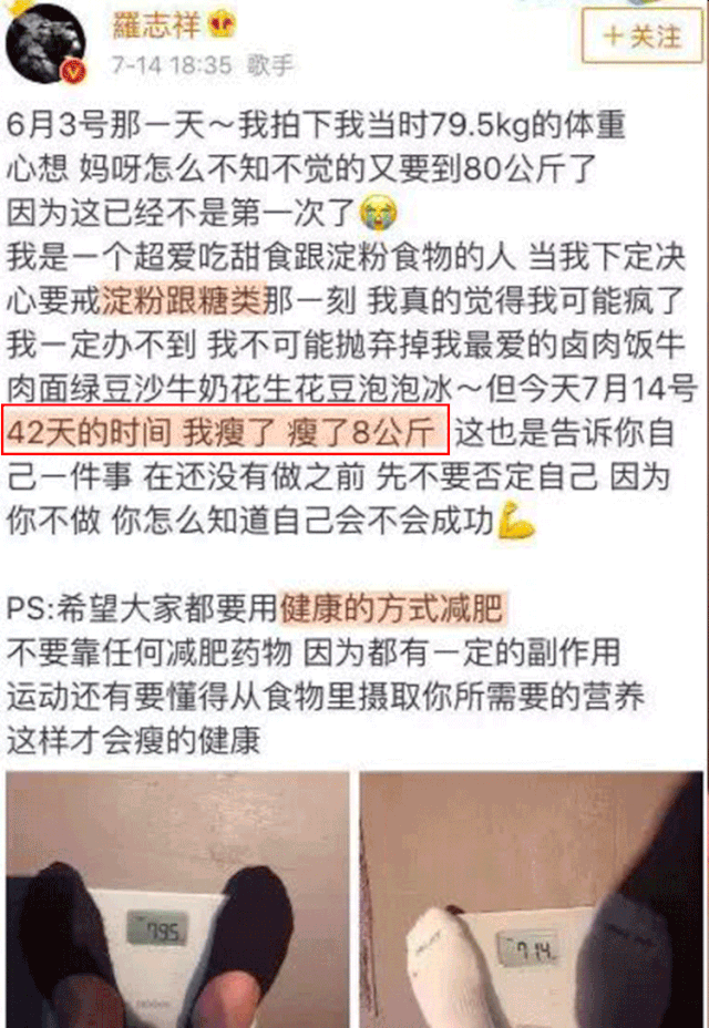 40岁罗志祥在微博晒自己抗糖的体验,42天,竟瘦了16斤;
