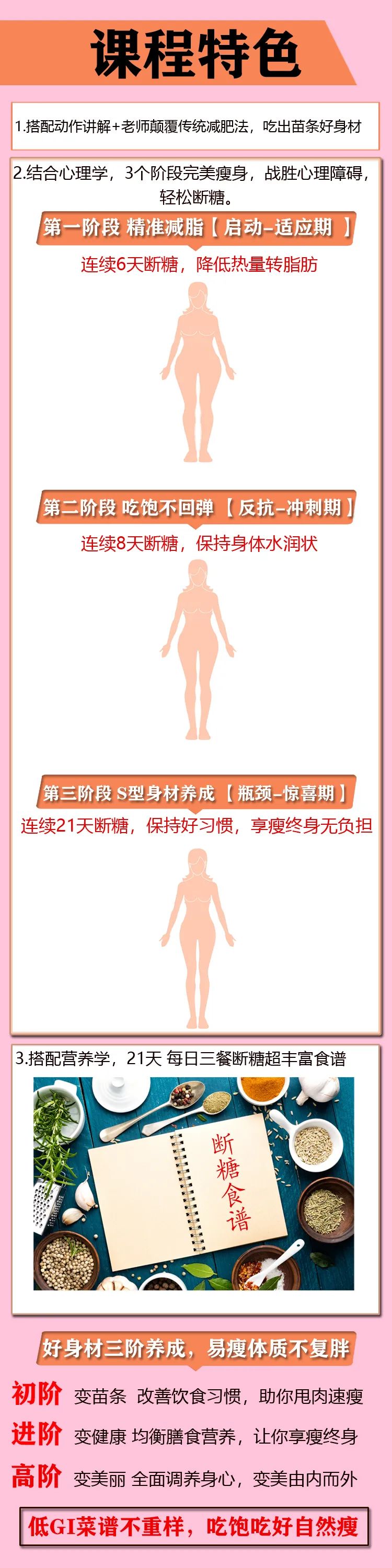来看干货满满的专属课表 让你: 不痛苦→不节食→不费力→美味和身材兼得, 皮肤变好,逆龄生长的瘦身美颜法 ↓↓↓