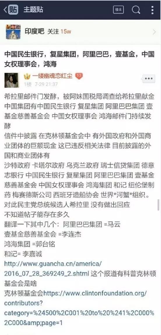 网络还有人提到,希拉里的“邮件门”事件中,有邮件披露了中国企业和个人给她竞选巨额捐款,但相关消息只是停留在网络帖子的层面,没有确切证据