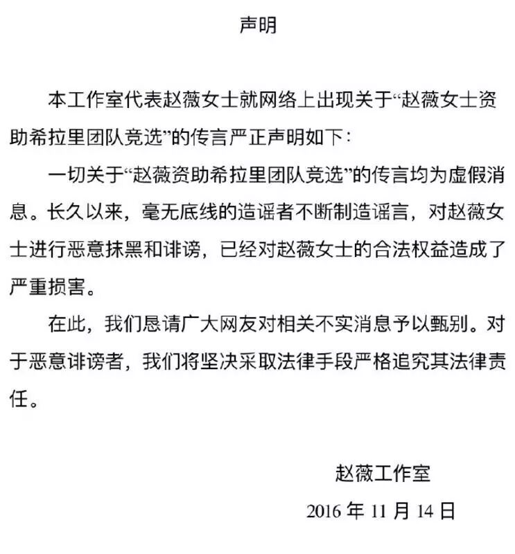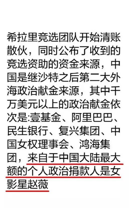 首先就是昨天有一批微博帐号发布了文字几乎一样的消息,说赵薇给希拉里送钱,资助她竞选