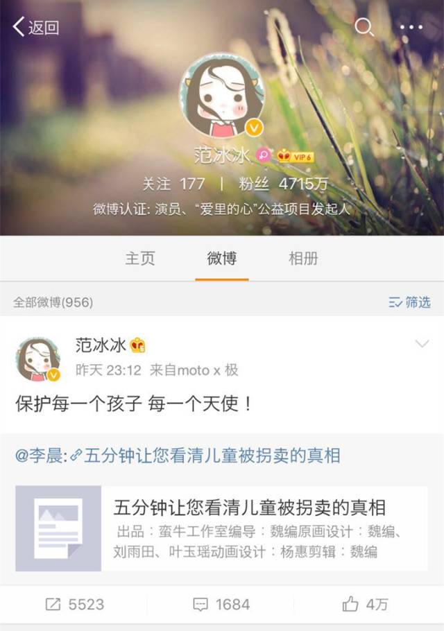 前几天范冰冰转了李晨一条微博,是关于国内拐卖儿童的视频,视频只有五分钟,看完让人有种说不出的难受...