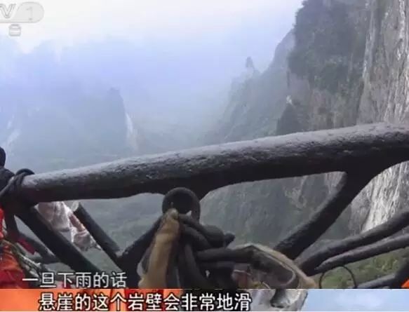 在陡峭的600米绝壁上,清洁工师傅每天的工作就是把生命付之于安全锁上,一点一点清理游客丢下来的垃圾。