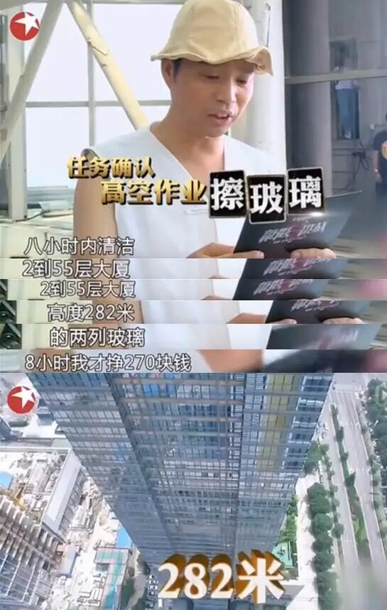 王迅在体验高空作业擦玻璃时,八小时内要清洁完282米高的大厦玻璃,而劳务费只有270块钱。
