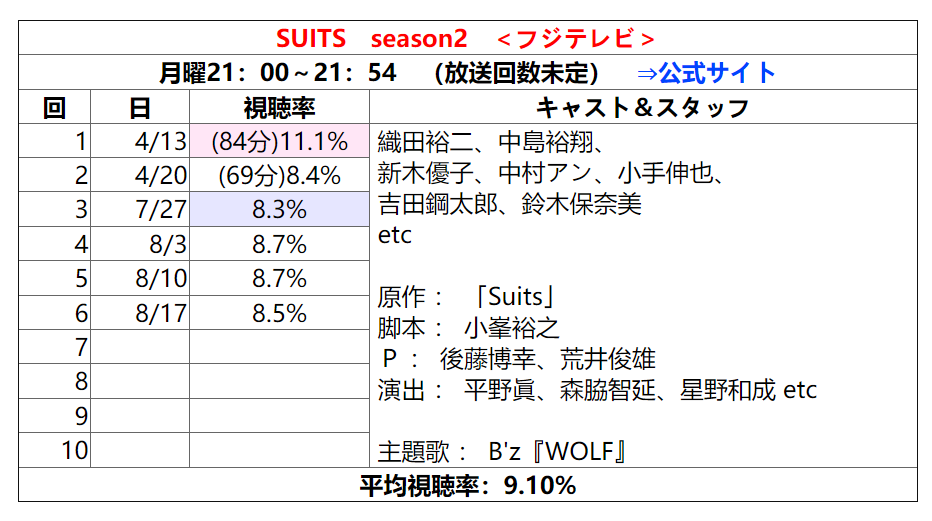 作为富士电视台招牌的月九档(周一晚上9点),复播后的4集的收视率却均低于9%,与目前其他剧火热的收视率相去甚远。