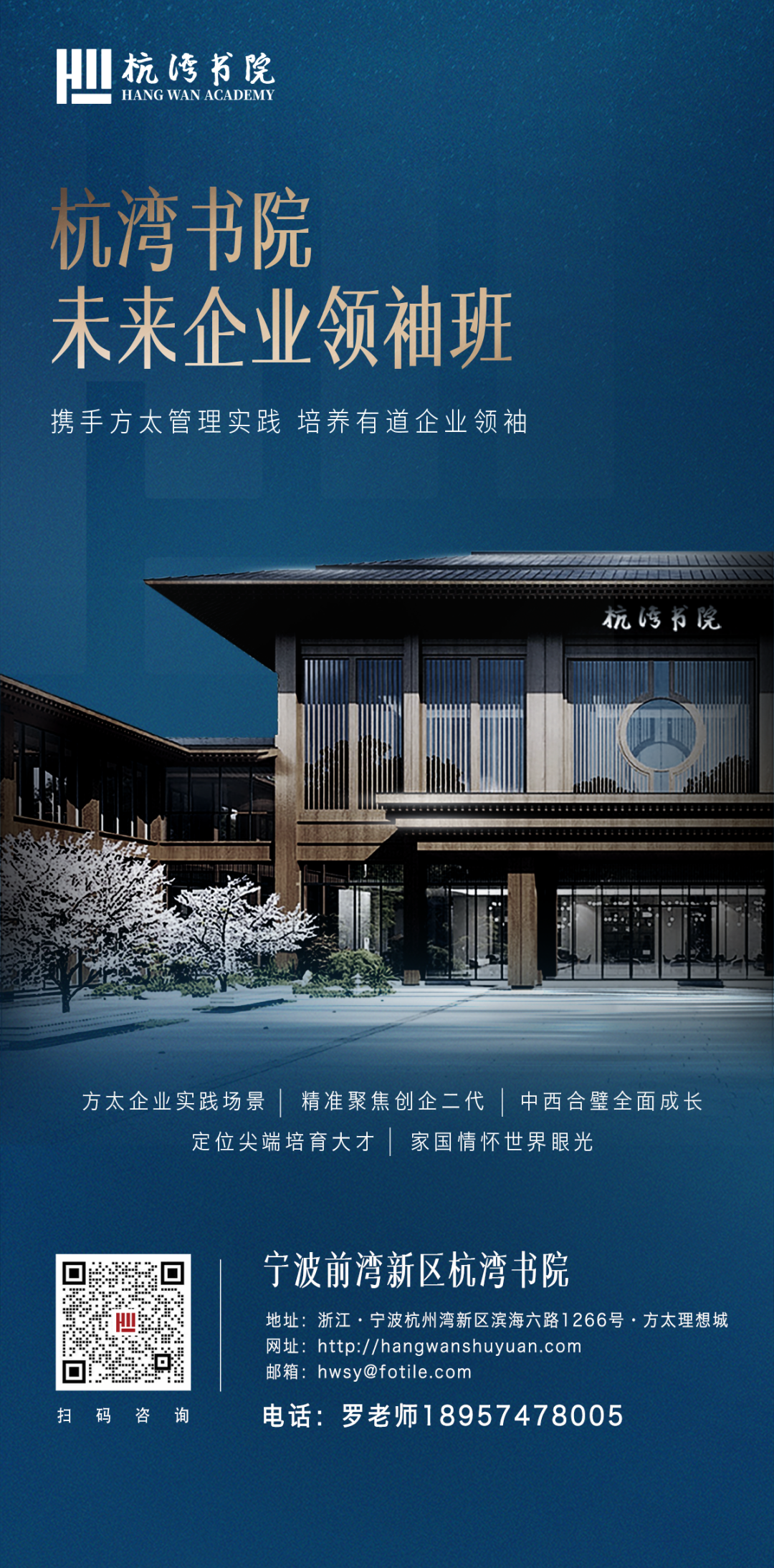 由方太集团名誉董事长茅理翔先生和董事长兼总裁茅忠群先生共同发起成立杭湾书院,依托中西合璧的方太企业经营实践和方太企业教育体系,精准面向18-25岁大学应届毕业生为主的未来企业接班人;构建明心、健身、齐家、治企、爱国利天下五大教学主题,旨在培养年轻一代企业家成为利国利民的大才。