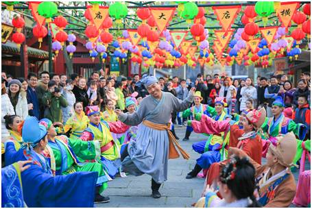 江南大庙会位于横店大型夜游影视主题公园——梦幻谷景区内,在江南水乡区域,挂灯笼、贴春联,充满年味的江南大庙会已经布置完备,踏入其中仿佛走进了一幅美妙的画卷。上万只七彩灯笼和喜庆的大红灯笼相得益彰,缀满水乡的街巷。在彩灯之下,擦鞋师傅、卖花姑娘、挑担货郎等各式人物晕染出了民国风情;此外,北方雄狮、舞龙、抖空竹等河北吴桥传统杂技杂耍让百人团大开眼界。还有,现包汤圆、糖葫芦、石磨豆浆、现打麻糍等传统庙会美食,以及“老横店”系列美食和“横店八大厨”精心准备的特色小吃满足了游客们的味蕾。