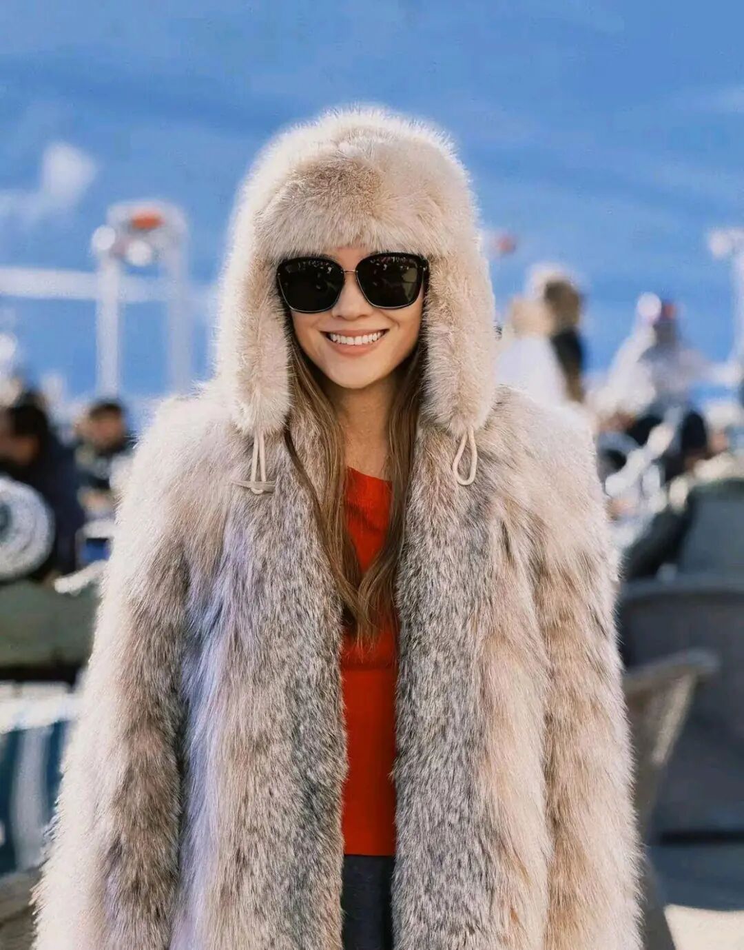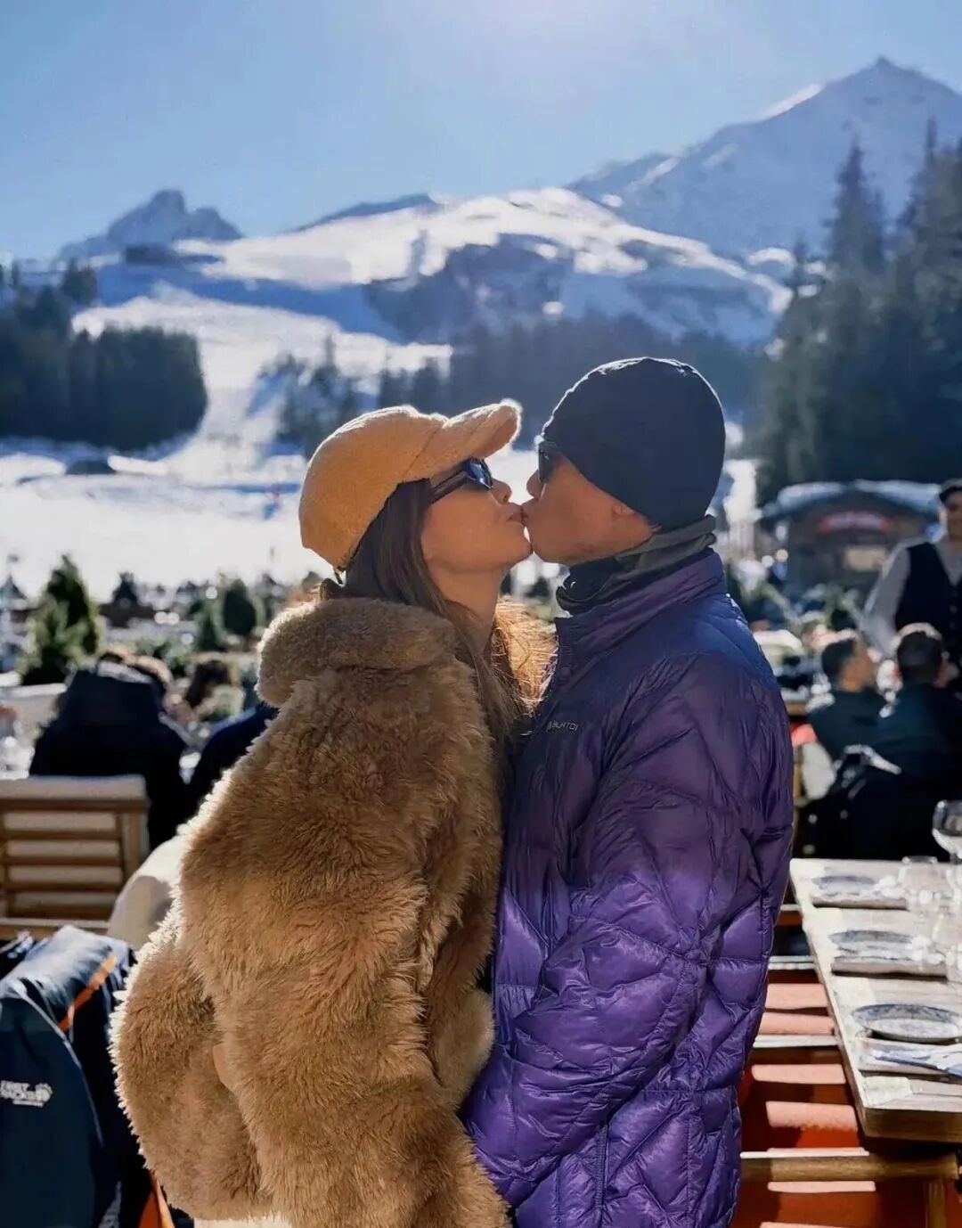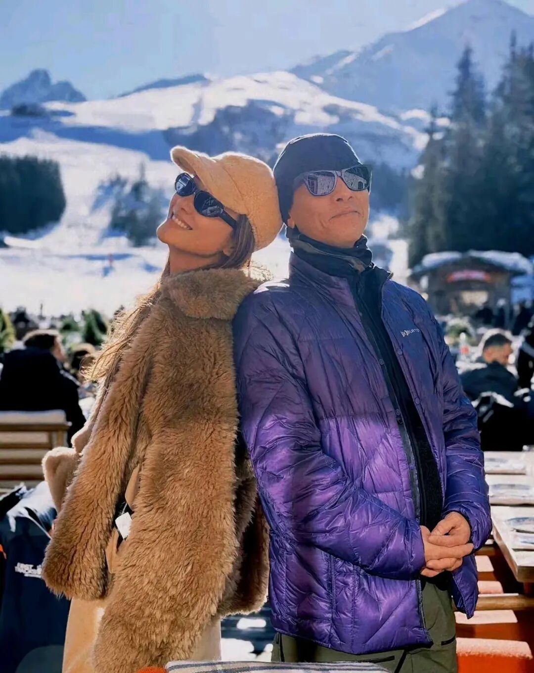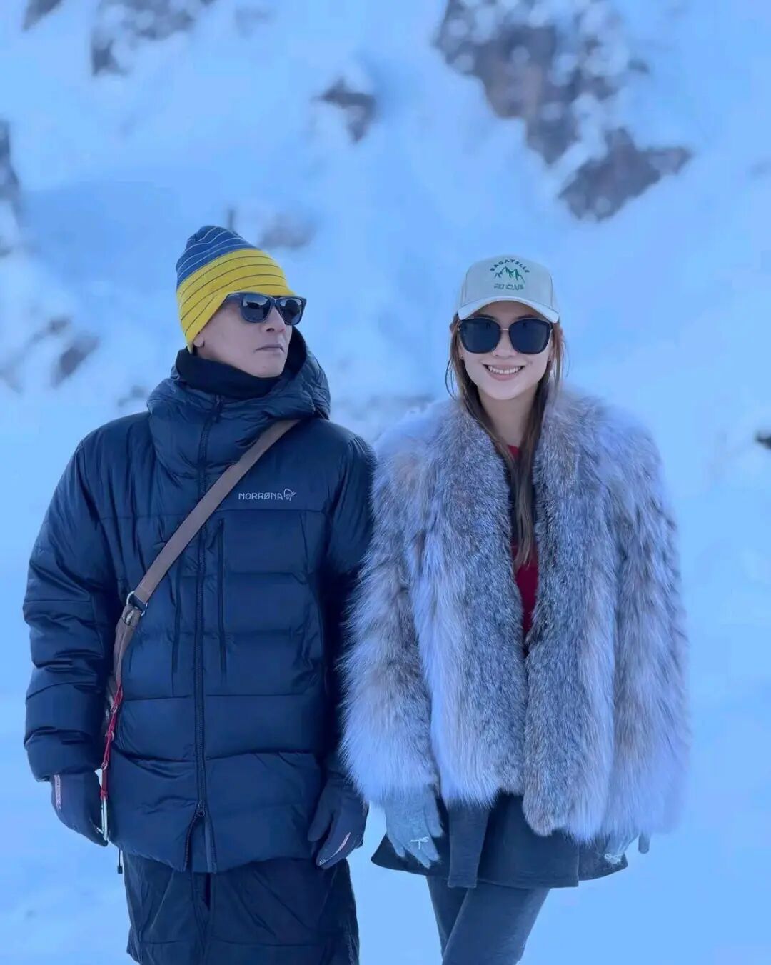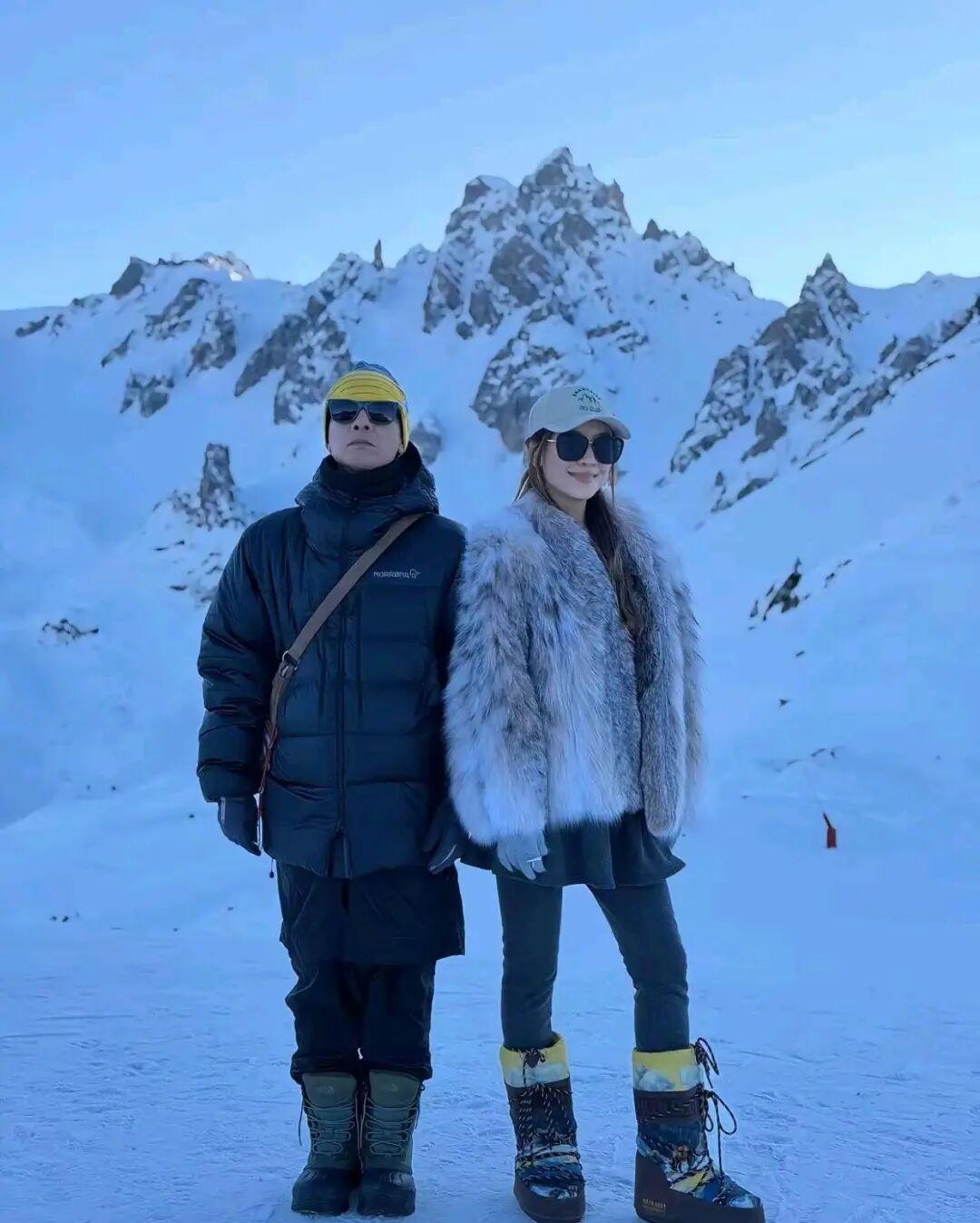 照片中,两人似乎是在雪山附近游玩,天气比较寒冷,应采儿身穿一件银灰色皮草外套,搭配利落的妆容,既保暖又不失时尚感。