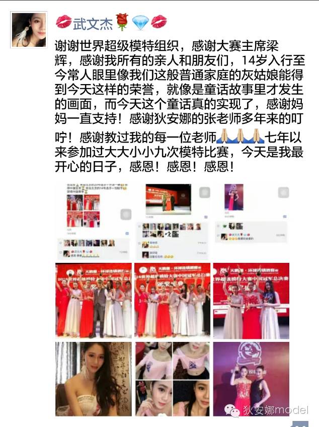 武文杰:当时,他对我俩说过的一句话:“你俩的条件非常棒,一定要相信自己,做模特一定要走出家乡,你俩的条件是可以走向全国的,也有可能站在世界超模的领奖台上。”半年后,我从2008elite世界精英模特大赛内蒙古选拔赛上拿到季军!一年后,我从2009第九届中国职业模特大赛内蒙古选拔赛上拿到亚军!再到2016的世界超模大赛中国冠军和全球总冠军,跌跌撞撞、磕磕绊绊这一路走来,得到了张老师的很大鼓励和支持,他给我自信和目标,始终严格要求我们,照亮我的模特人生路,让我在这条路上昂首阔步的走下去。”