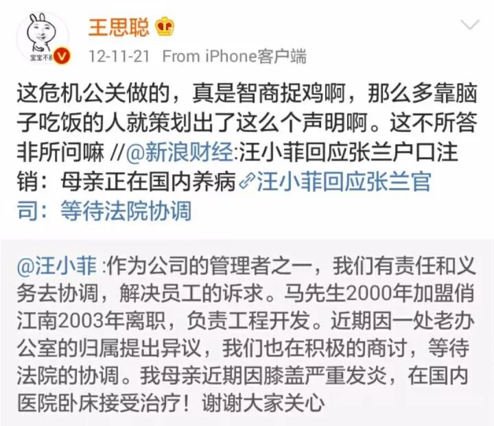 随后张兰陷入国籍门,王思聪又针对汪小菲作出的回应,讽刺其“这危机公关做的,真是智商捉鸡啊”。