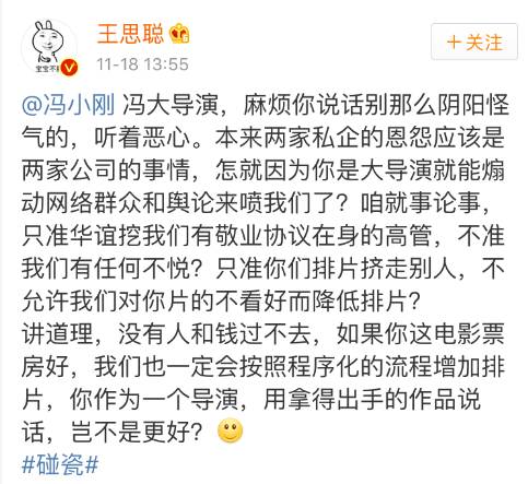冯小刚不满排片量,写了封公开信《潘金莲致王健林先生的一封信》,王思聪也直接发文怼回。