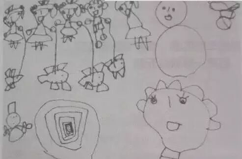 这个时期的孩子的画多以连续的圆圈为主,开始对自己画的东西以自己对事物的印象加以解释说明,并且这些说明会不断的变化。越是脑海中对各种事物有丰富印象的孩子,越是有能力把一个圆圈想象成各种各样的东西。