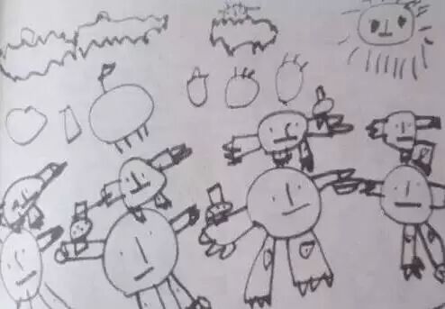3.对于孩子的绘画是不能用好坏来评价的,更不能用来做类似心理分析以试图判断孩子的性格,这完全没有意义。孩子的涂鸦仅仅和哭笑一样是表达心情的一种方式而已。一副孩子为了表达自己内心的感受或想法的画,即使在技艺上还未成熟,但通过这种自由的绘画方式使得表达的愿望得到了满足并体验到了愉悦,这就是表达的快乐。