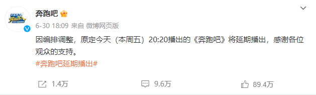 原定于6月30日播出的《奔跑吧》发出延期公告。