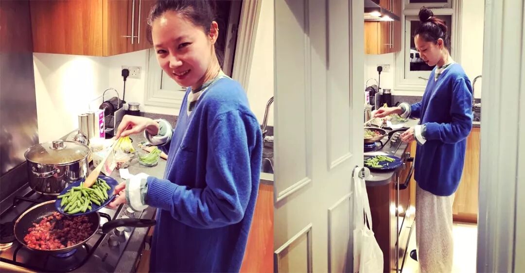 在家里的她非常自然随性,扎起丸子头做菜像个亲切的邻家大姐姐▼