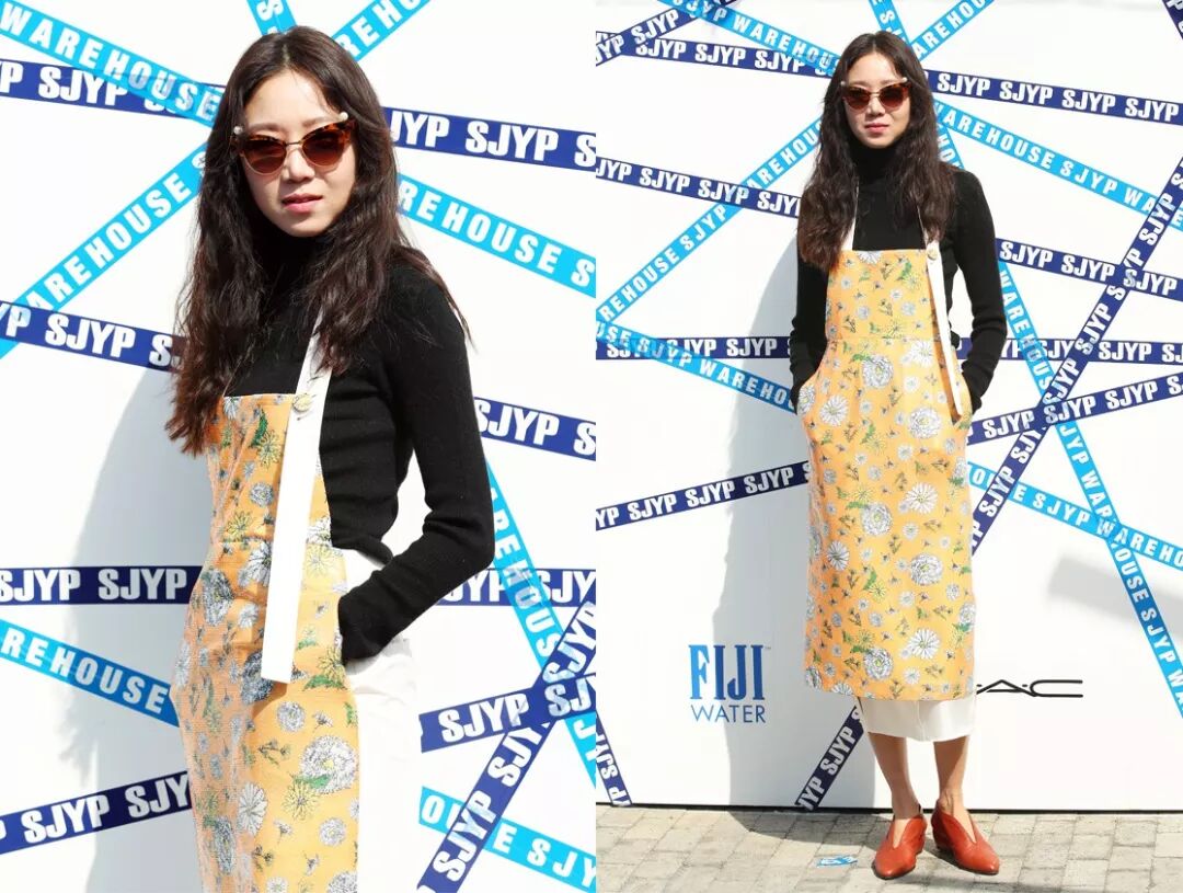 这套碎花裙+黑色高领衫的look还是蛮考验个人气质的,但是孔孝真却能轻松hold住~▼