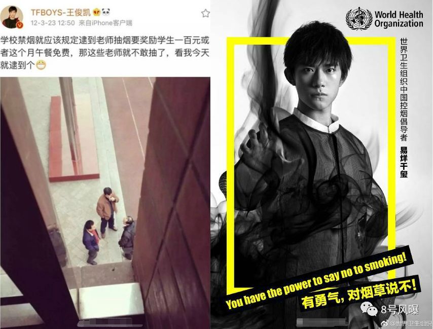 只能说吃瓜群众的快乐是无穷的,这个时候还能猛拍脑袋想起来,队友王俊凯举报过老师抽烟,而易烊千玺是世卫生认证的控烟倡导者啊。