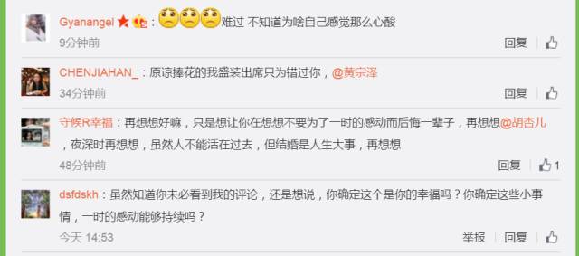然而,还是有很多网友“不识趣”地跑到她的浪漫宣言下,表示心酸和难过。因为事实不像大家期待的那样,新郎不是黄宗泽。毕竟,那段七年的爱恋,虽然几经分分合合,但其中的陪伴与甜蜜还是让人怀念。