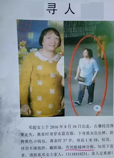 8月16日早上8时左右,37岁的邓超独自驾驶一辆银灰色面包车,从位于东区银江镇五道河的家出门。9时20分,姐姐邓燕在五道河至倮果公路边(距倮果花园500米处)发现了邓超的面包车,当时,面包车前车轮陷入路边排水沟里,邓超却不知去向。因为邓超没有带手机出门,家人无法联系上她。
