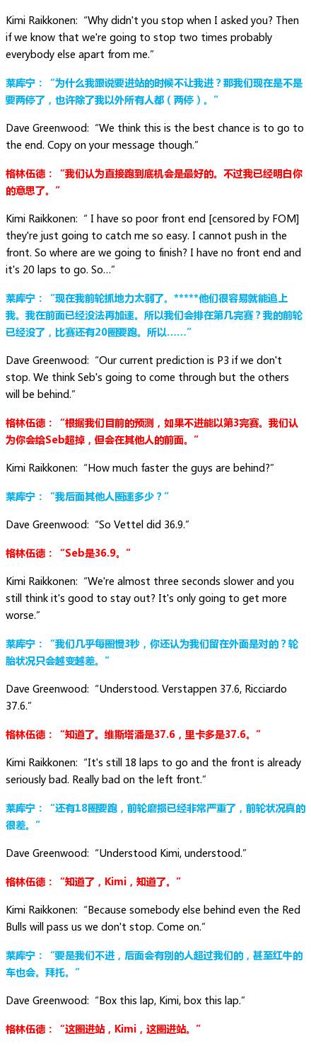 值得注意的是,中国站赛后法拉利全队上下,除了冰人自己以外,没有任何人谈到为何7号车组的第二次进站发生得如此之晚,使得Kimi返回赛道时甚至落到了红牛青年队的小塞恩斯后面。即便是身为因为法拉利决策失误受益的对手,红牛领队霍纳也对跃马的战术直呼看不懂,日前他在接受媒体采访时说: