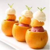 ↑把三个冰激淋球放在切开的橙子上,看起来好像是迷你玩偶的下肢,上半身和脑袋,最有意思的是,在三个冰激凌最上面的白色冰激凌上,还开出了三根绿芽,试问一下亲们,这般可爱的冰淇淋,你舍得吃掉它吗?