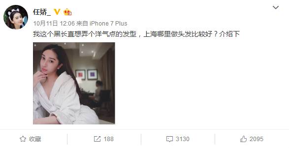 我们再回头来看看任娇的情况,抑郁症一说着实让人难以相信,因为任娇11号还在微博表示想弄个洋气点的发型,问大家上海哪里做头发比较好。