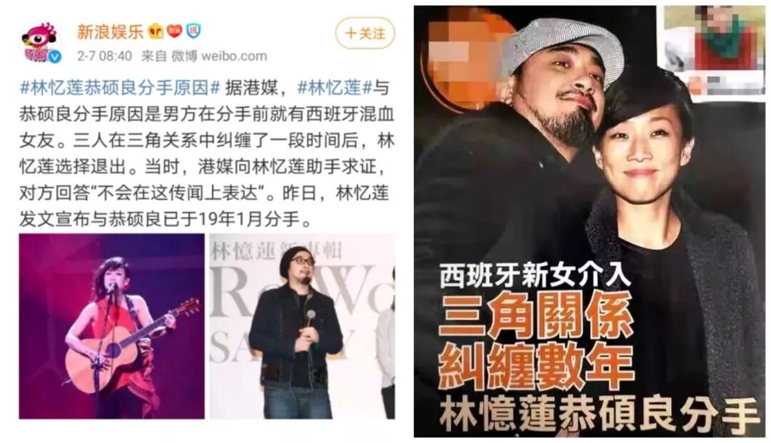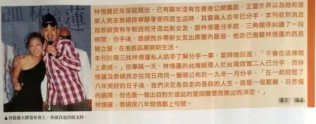 网传分手的原因,俗套而无趣,男方在分手前交往西班牙混血女友,三人在三角关系中纠缠,林忆莲选择退出。