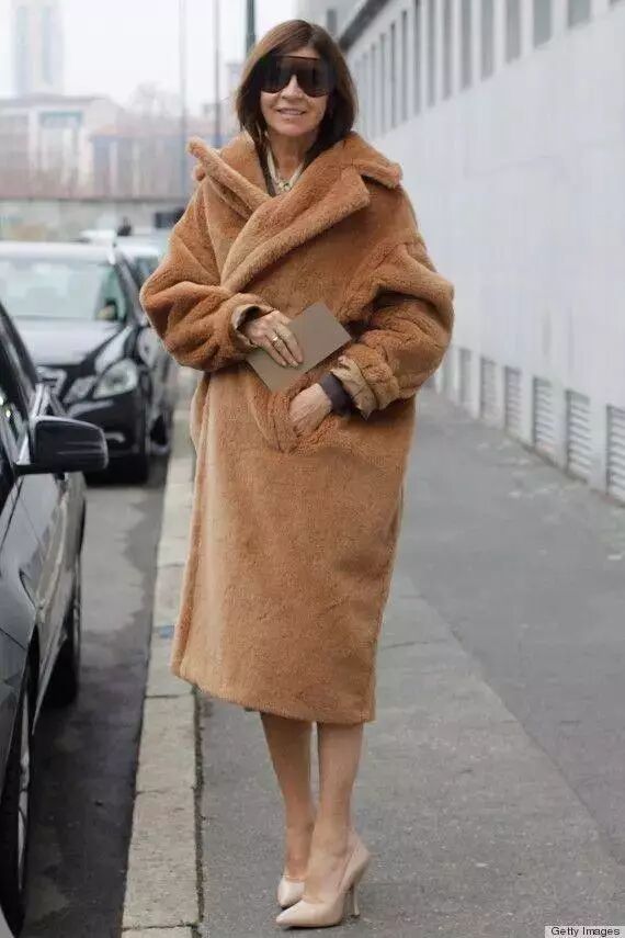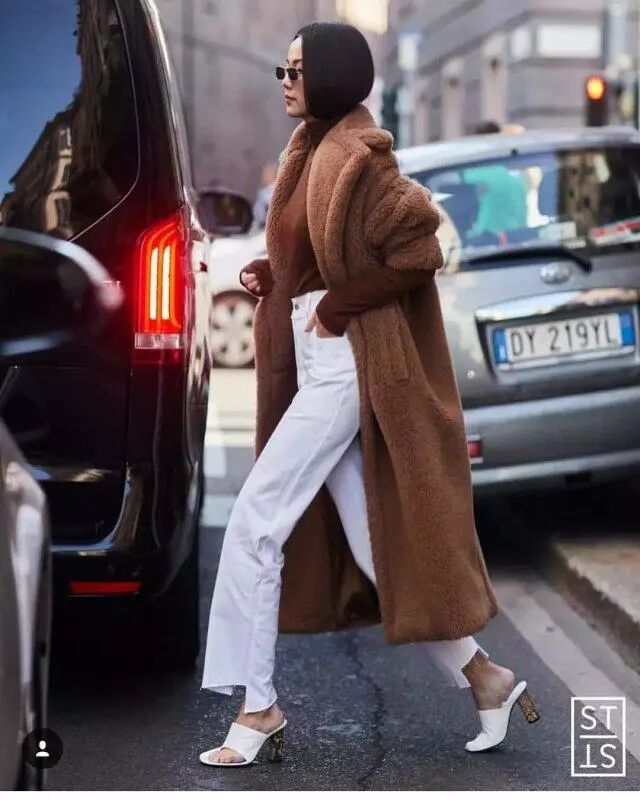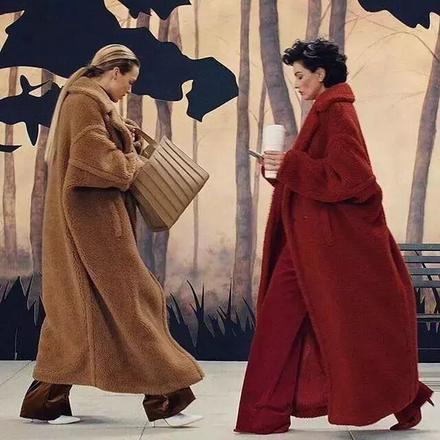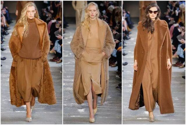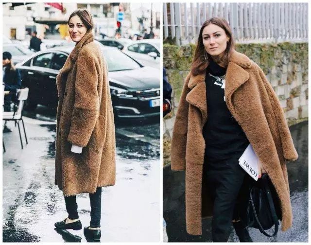 最经典的自然是 MaxMara 家的,除了上文热巴马思纯的红泰迪,今年的 T 台上是一片焦糖色的各种款式泰迪外套,内搭不同深浅的棕,不只是温暖,质感也是好炸天。(全身上下写着 " 贵 " 字)▼