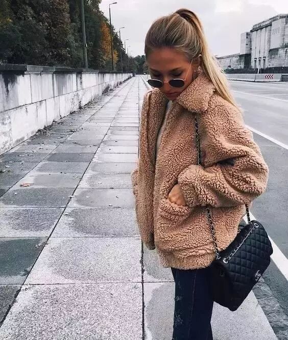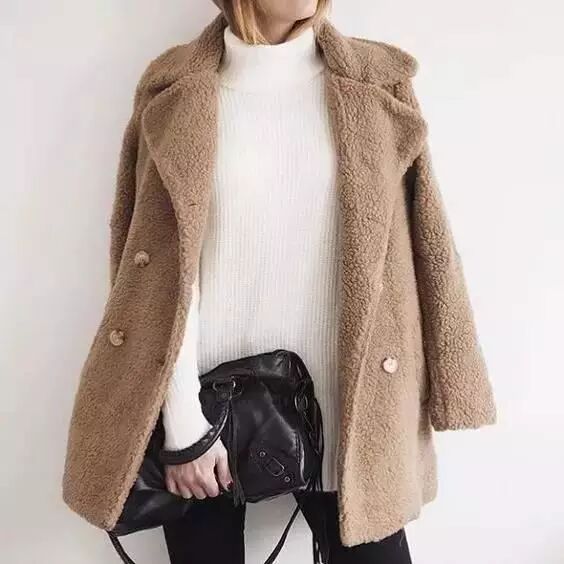 泰迪熊外套的好处我刚刚已经说过了,主要就是保暖还兼具萌味儿,这是其他大衣所不能取代的特点,所以备受姑娘们的喜爱。