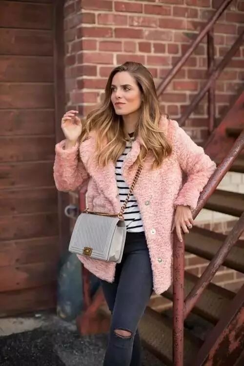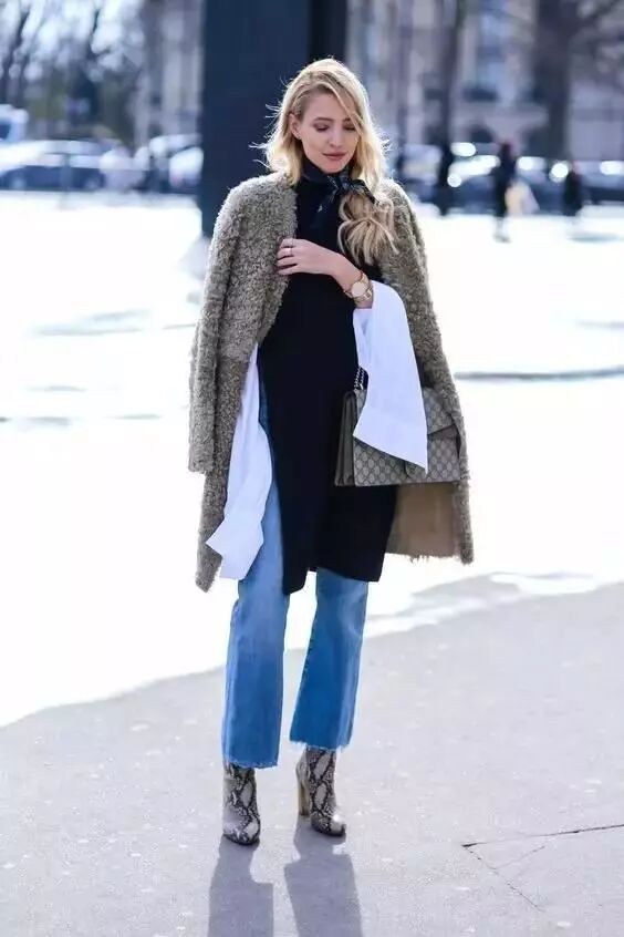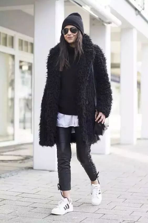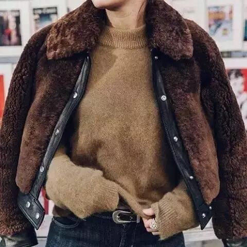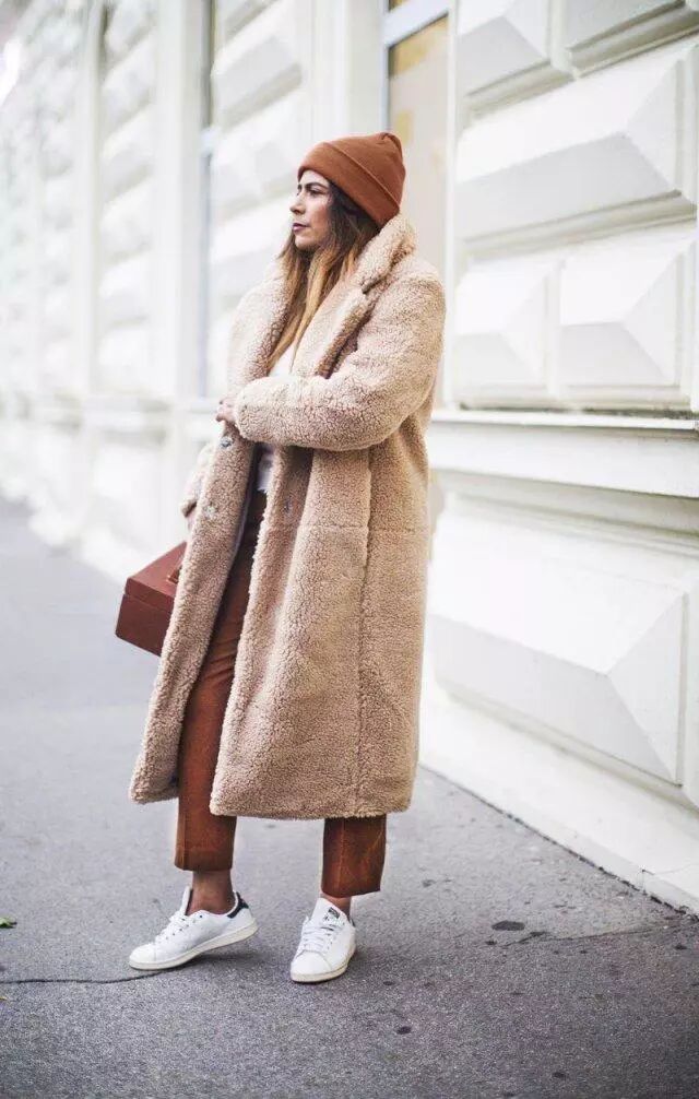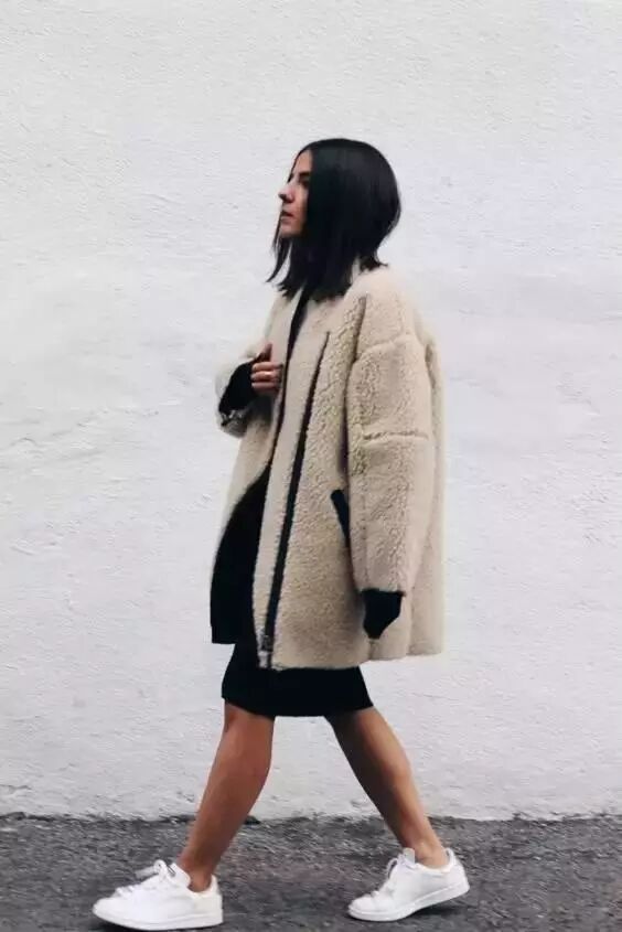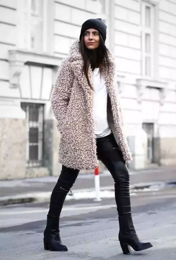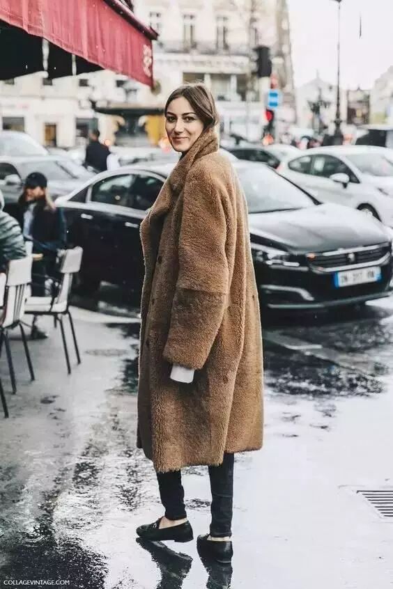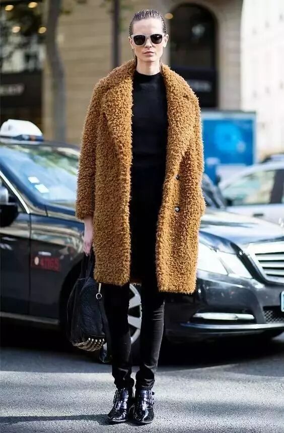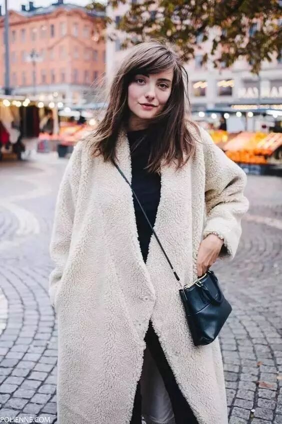 很多姑娘担心泰迪熊外套过于臃肿,但其实内搭一身黑显瘦显时髦都做到了。
