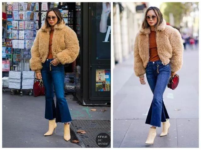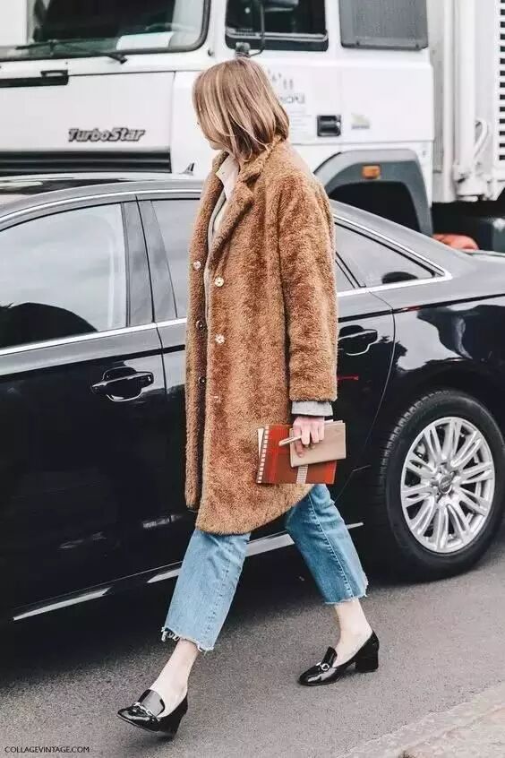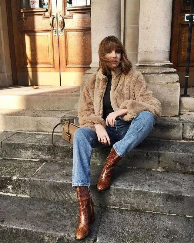 像这样,选短款泰迪外套 + 复古的 mom 牛仔裤 + 短靴,保暖又时髦▼