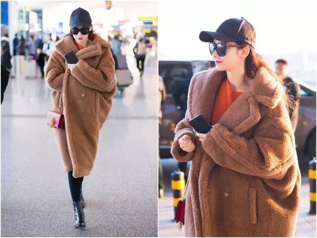 戚薇前几天机场也穿了 MaxMara 的泰迪外套,搭配棒球帽与皮短靴,温暖轻松也有一点酷酷的感觉。很实穿。▼