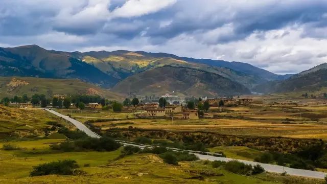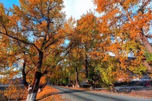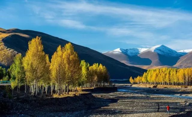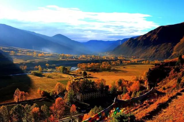 金黄的柏杨,连绵起伏的山峦,错落有致的藏寨,整个地方被秋色完全笼罩着。