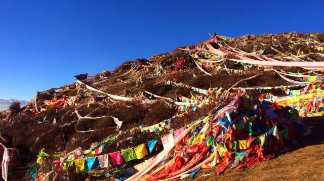 这里平均海拔多在4000米以上。日照充足,为高原季风性气候。经幡挂满了山顶,在风中摇曳着,站在最接近天的地方为此祈福。