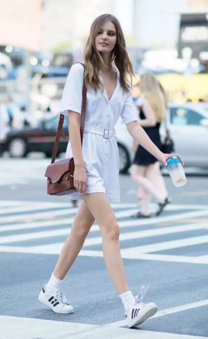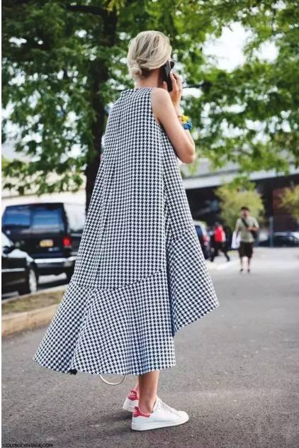 看到了没有,无论你是短裙、及膝裙、过膝裙,还是百褶裙、紧身裙、伞裙甚至旗袍!都可以搭一双运动鞋!