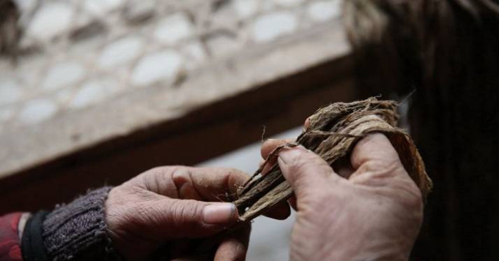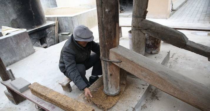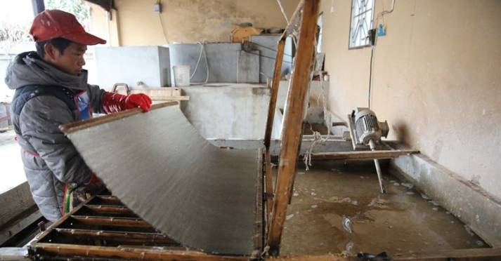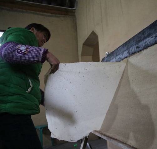 整个过程有36道大工序、72道小工序,主要有泡皮、灰皮、蒸皮、踩皮、抖皮、捡皮、伐皮、踏碓、切翻、打浆、捞汁、压纸、晒纸等,每道工序都要很认真地去做,所用的器械也都是自己制作的。记者看到,作坊里有很多池子,每个都有专门用途。构树皮经过一定前期处理后还要人工挑拣,要用特制的刀具切成碎料,然后才能放进打浆池。在捞纸环节,工人要完全凭自己的经验掌握纸张的厚度。捞出来以后叠放在一起还要压制,之后一张一张揭开,贴在室内的“火墙”上烘干。直到这个环节,才算成品完成。