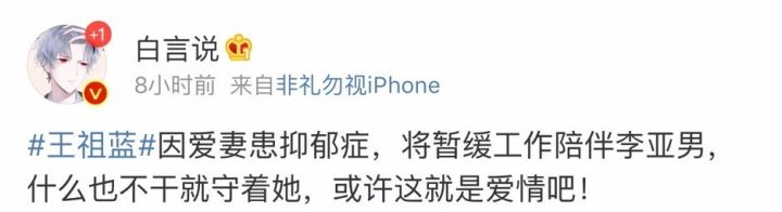 今天刷微博的时候,无意之间看到一条新闻:王祖蓝因爱妻患抑郁症退出娱乐圈,什么都不干,就守着她了。