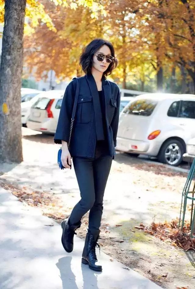 深蓝色的外套搭配宝蓝色的丝绒小背包,尽显高贵气质,大号的外套与靴子可以让腿显得更细更长,墨镜与机车短靴上下呼应增添酷感。