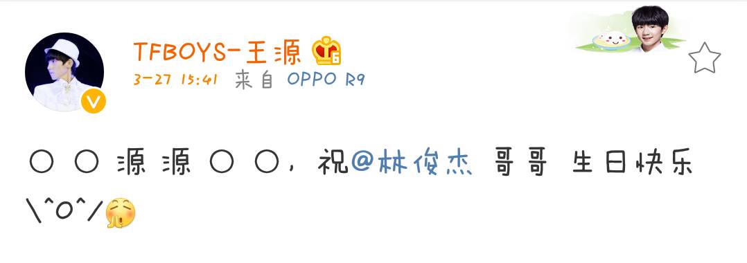 王源花式发博,祝福偶像生日快乐 tF家族 内地男星 2016-03-27 21:51:18 353 创作不易,用心坚持,欢迎请BaGua喝几杯爱心咖啡!打赏并支持本文 打赏并删除本文 今天下午,王源发微博祝偶像林俊杰生日快乐,有心的源源巧妙地借用了林俊杰的歌词。小编来翻译一下: (○○源源○○)圈圈圆圆圈圈,天天年年天天的我——《江南》 对此粉丝纷纷留言表示“源源好萌”,“你要好好唱歌,成为像林俊杰那样优秀的人”“源源好可爱”。 创作不易,用心坚持,欢迎请BaGua喝几杯爱心咖啡!打赏并支持本文 打赏并删除本文 感谢您的支持鼓励,我会继续努力的!文章地址:用户邮箱:打赏金额:USDT 请输入数字点击”去打赏“,即可进行打赏支持本文章哦 王源 About the Author tF家族 功能介绍:TFBOYS粉丝团,关注即可收听三小只的独家语音!让我们一起支持这三只吧!<王俊凯,王源,易烊千玺>加油!我们的最团结的TF家族! 官方认证:天津乐播科技有限公司 Related Posts no我保证你看了下面的照片一定会心疼!! 2017-02-18 20:01:12 TFBOYS确定加盟2017年春晚了! 2016-12-08 19:49:14 TFBOYS.绘图之凯源玺 2016-12-06 19:54:53 TFboys新歌第一名 2016-09-11 23:37:14 王源重庆中考时间公布 战斗两天半考7门 2016-06-08 11:54:10 发表评论