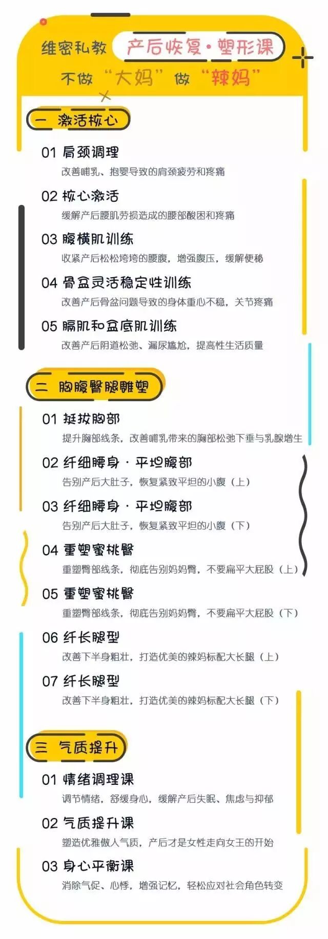 针对:针对产后妈妈胸、臀、腿等身体各部位特点针对性训练。