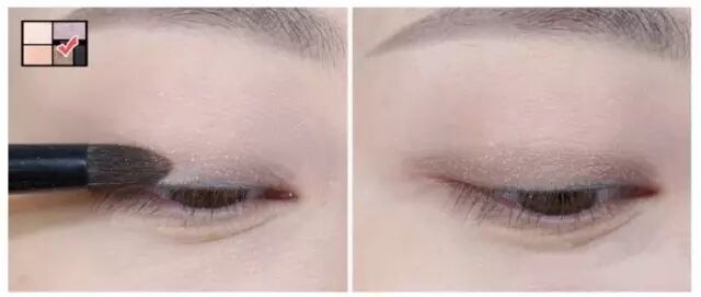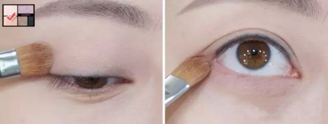 左上角小图的对勾部分是使用的色块!先是在上眼皮整体部位轻轻刷上一层淡淡的棕色,注意这里要将棕色与粉色都蘸取之后一起刷上去!这样才能看出棕粉色眼影的效果哦~~