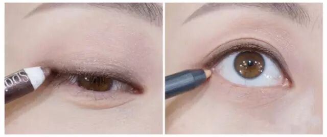 水原希子的眼线线条并不是做的很明显!先用棕色的眼线笔画出眼线线条,然后用晕笔将线条模糊!然后用基础色调眼线笔做出下眼线的线条!